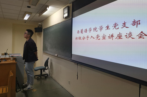 为进一步加深青年学子对党的了解、激发入党积极性,2019年10月9日晚6点,西葡语学院学生党支部在逸夫楼205教室举办入党宣讲会。宣讲会以“不忘初心、牢记使命”为主题,吸引了西葡语学院近50名积极分子参与,学生党支部副书记王宜印主持了本次宣讲会。