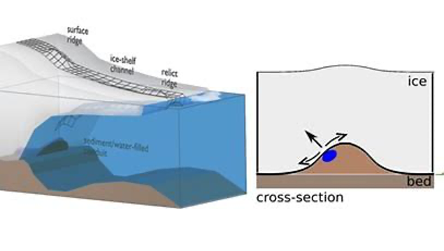 这些山脊被称为蛇丘斜坡rampas eskers),(蛇丘:由冰川融化后留下的沙砾和土形成的狭长脊)。它们比人们预期的要大得多,因此能够向上穿破冰层,从而割裂冰面,产生一条条的冰沟渠